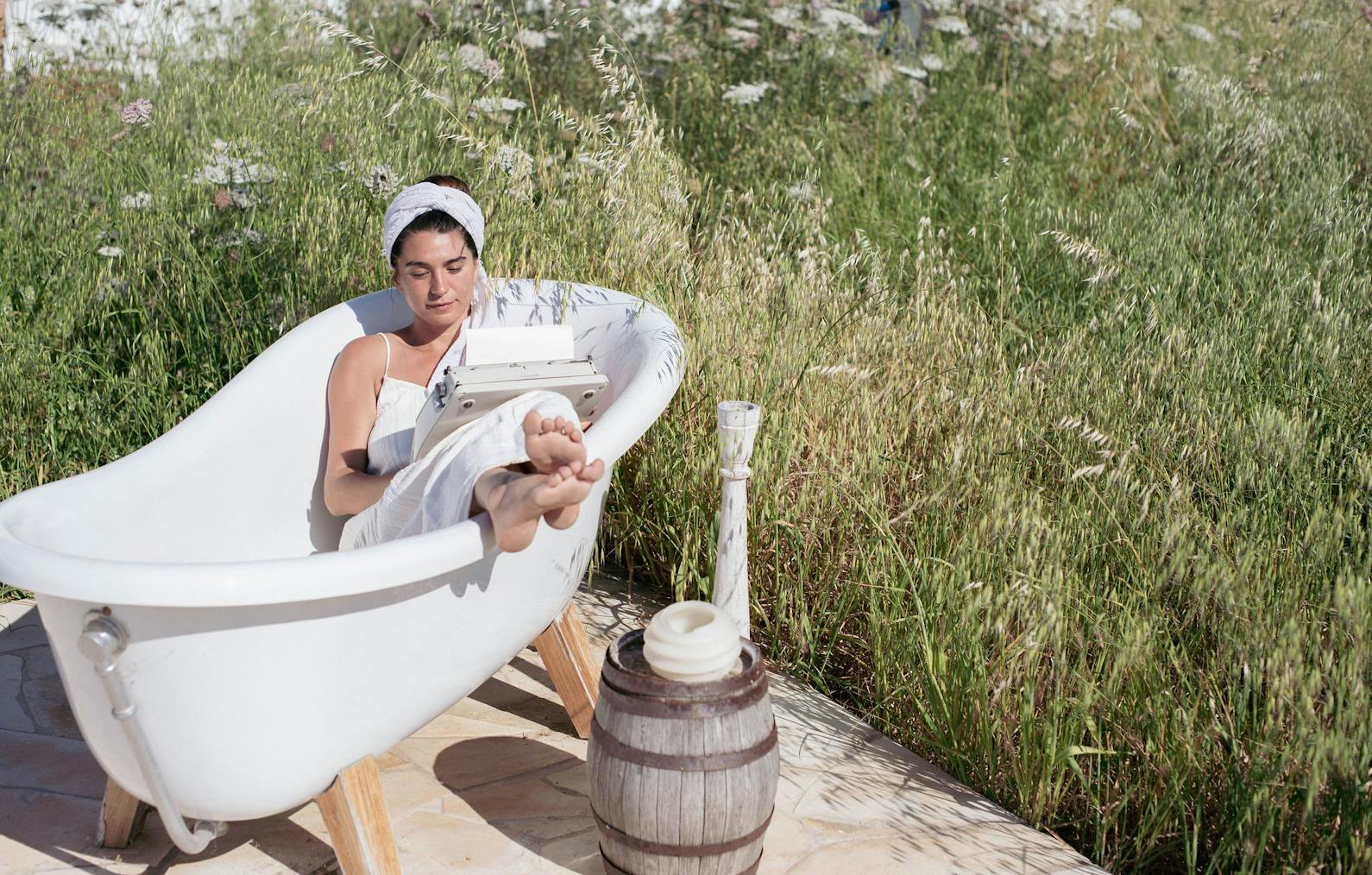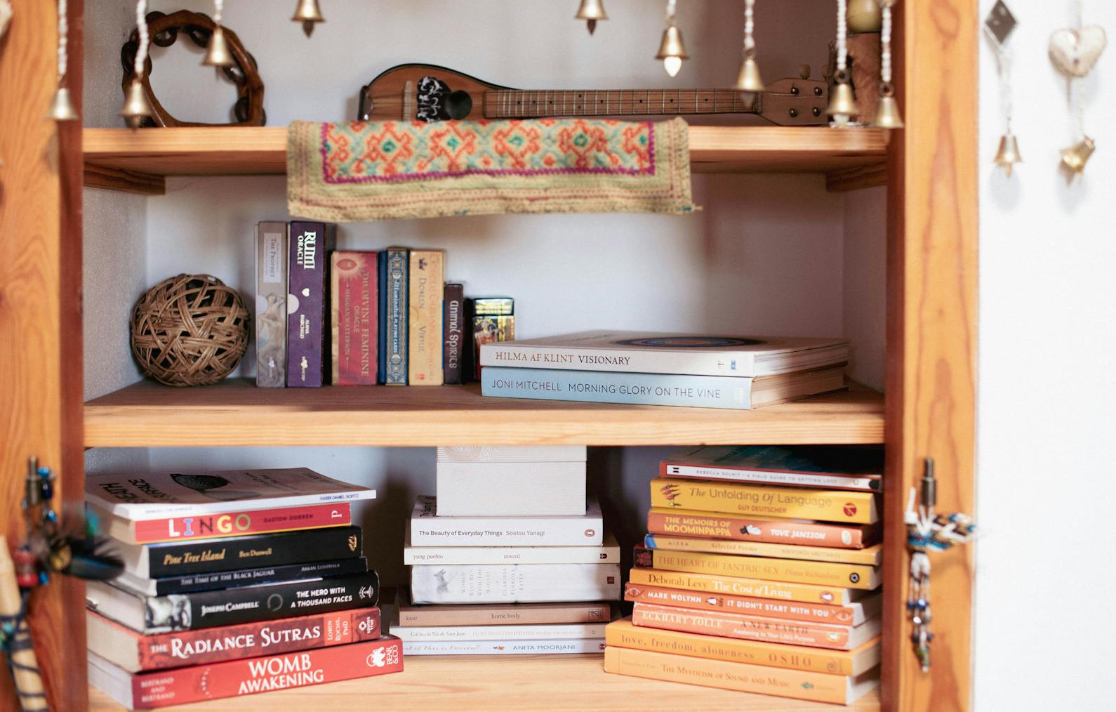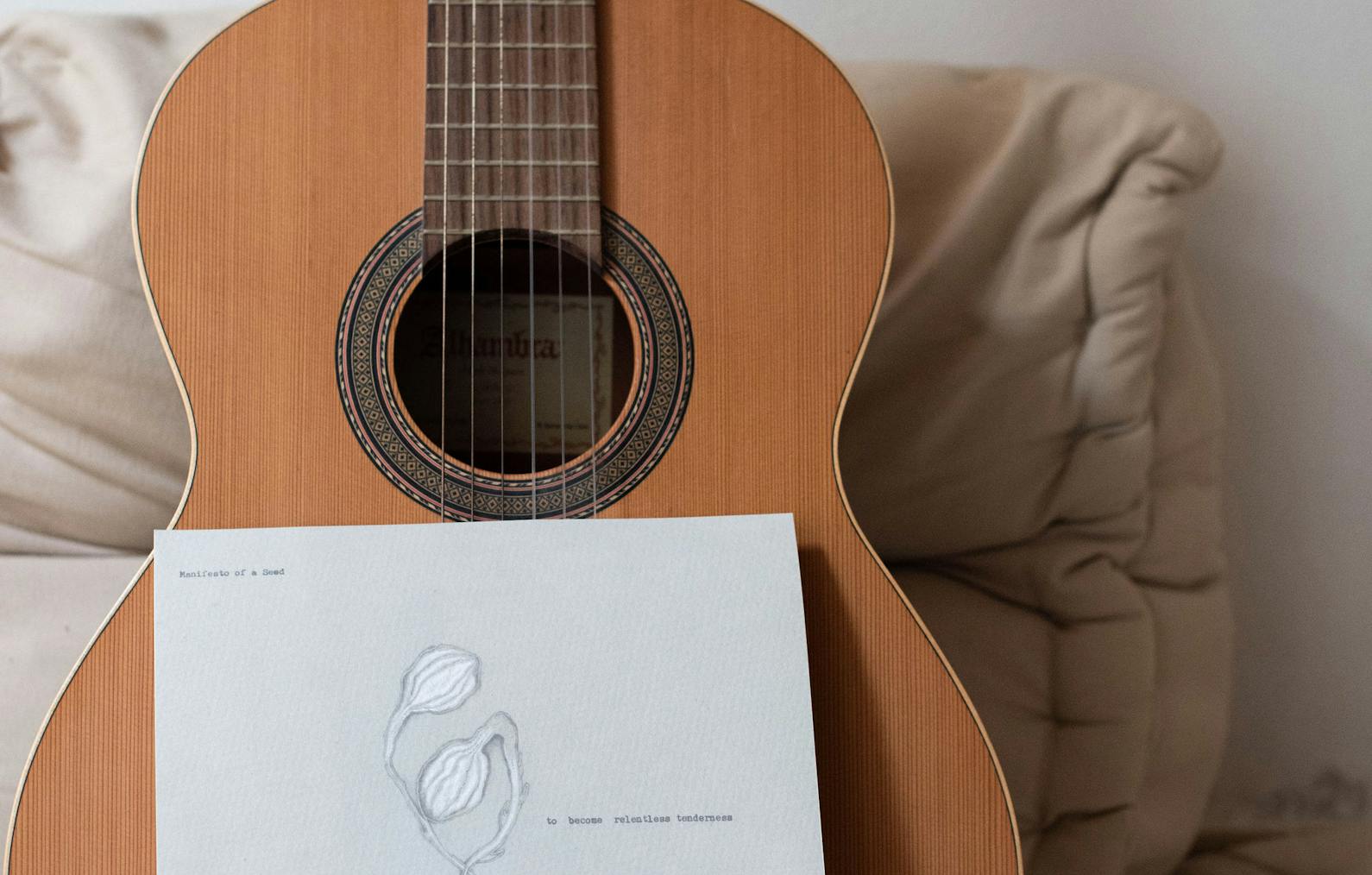 I try to get in the water as much as possible, it is deeply healing for me to let myself float and be held. Writing, journaling, listening to music fully. I started playing the guitar during the pandemic and it helps me to just gauge how relaxed I am. Because when I'm the most relaxed, I can play the best and I can sing. The music shows you immediately where you're thinking. Keeping my house like a temple reminds me to be in my godliness and to make cleaning a practice.