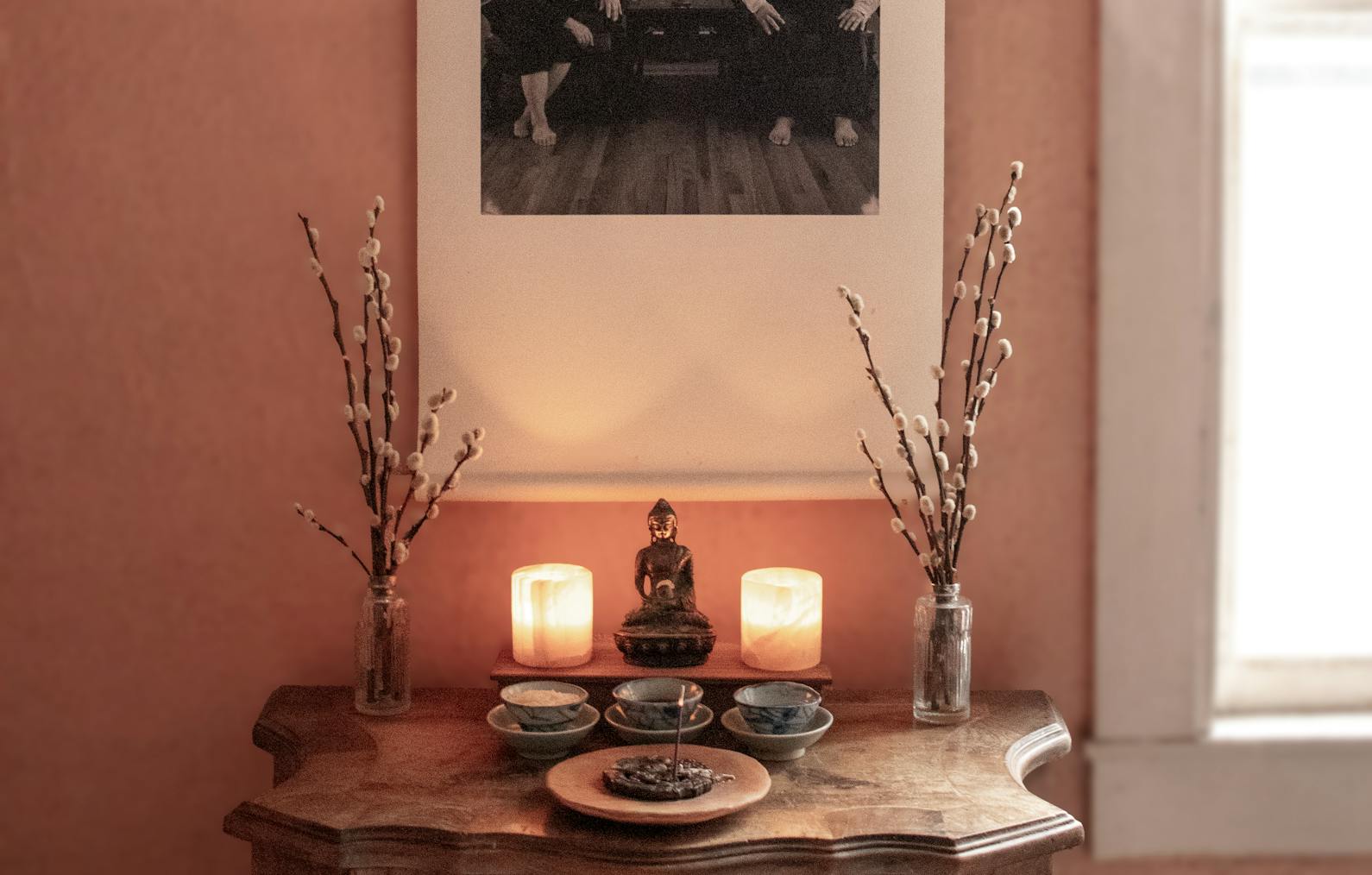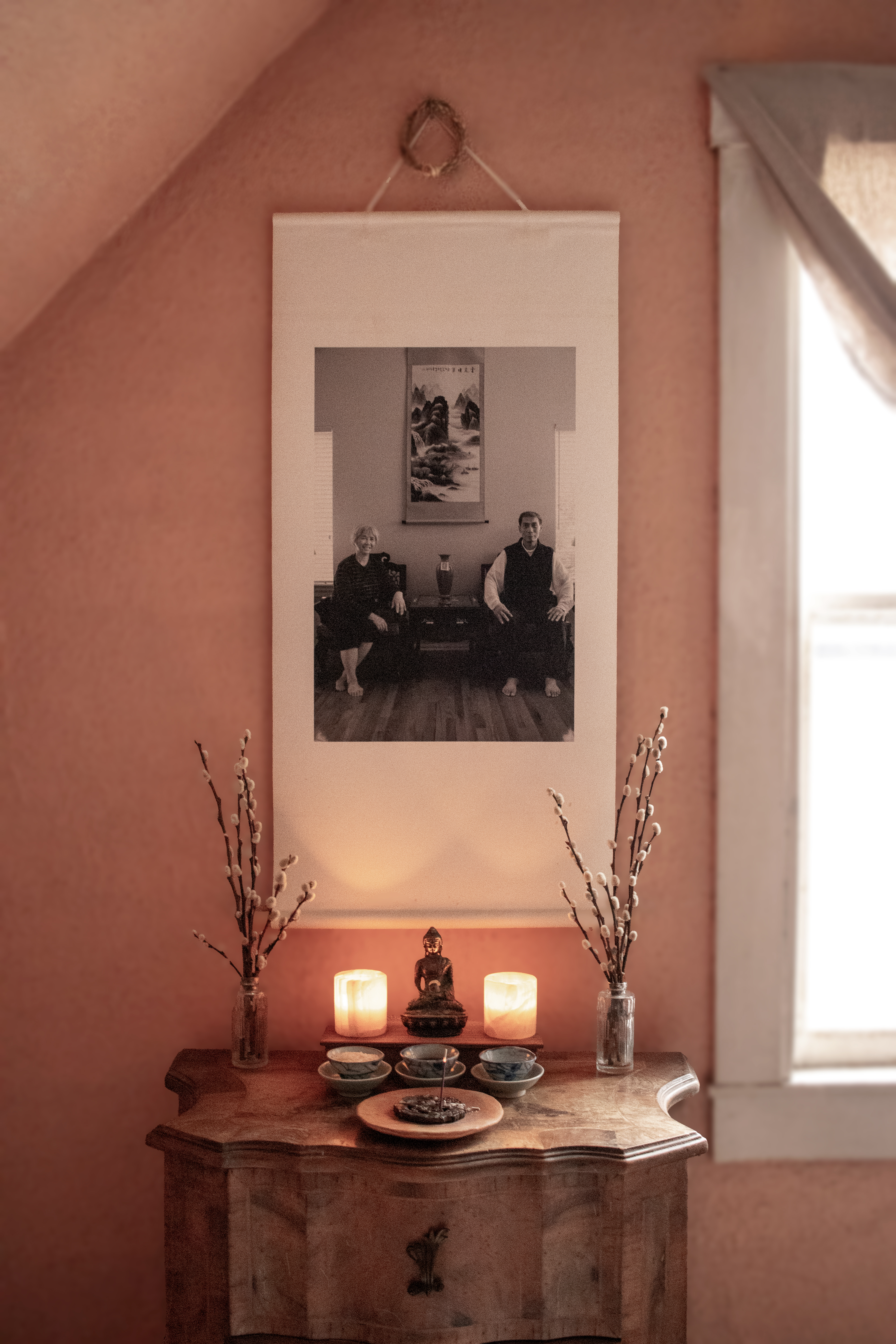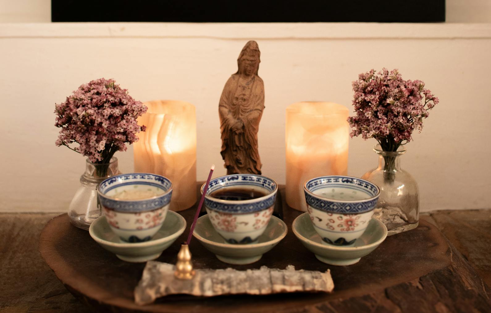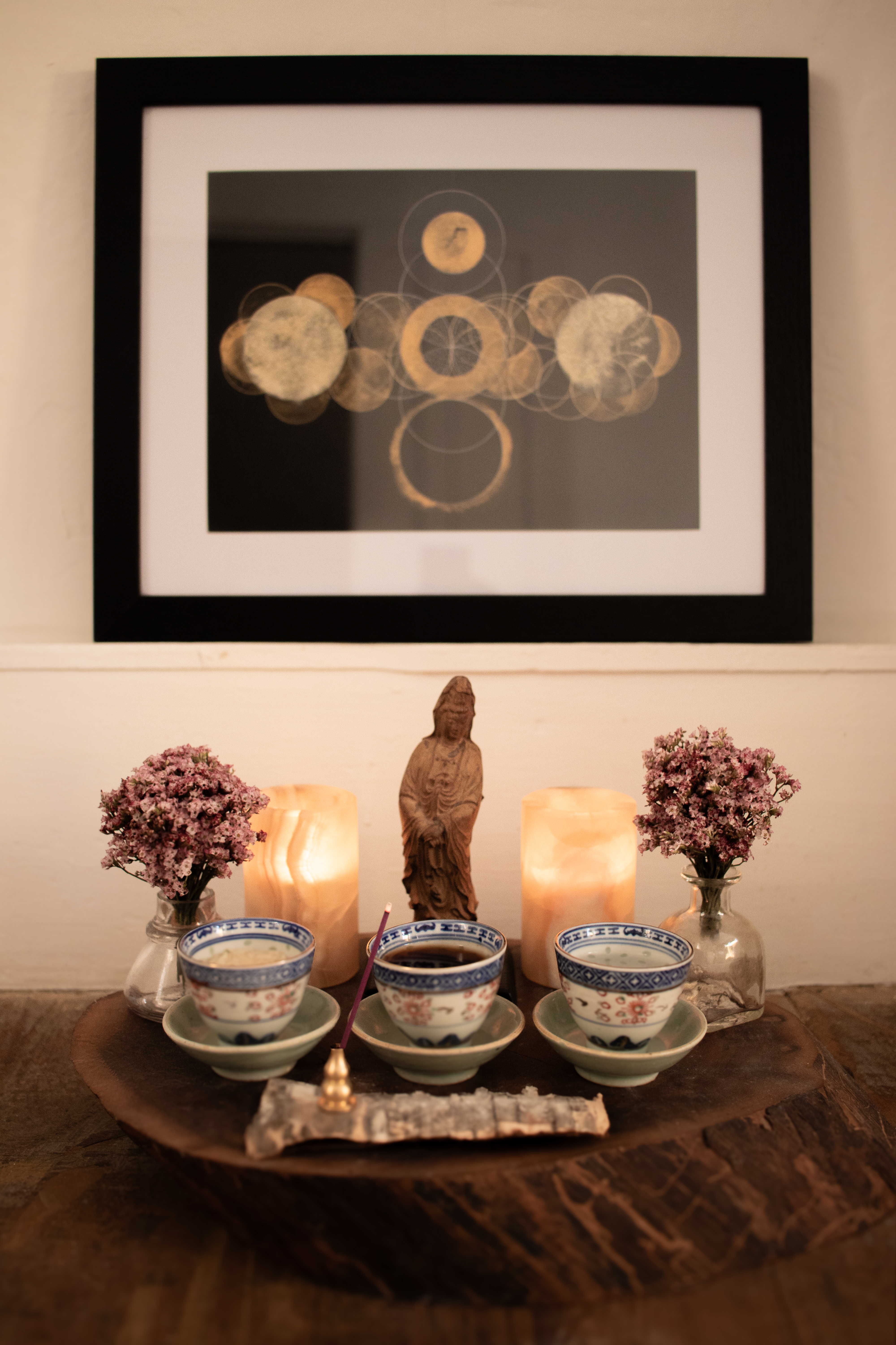 These days I aim to keep my altars clean, simple, and focused. Right now I have three —one to Quan Yin, one to Buddha, and one to Chenrezig, who, like Quan Yin, is Bodhisattva of Compassion, in Tibetan Buddhism. Each have small flower arrangements, a place to make incense offerings, and three gongfu teacups filled with tea, water, and rice.