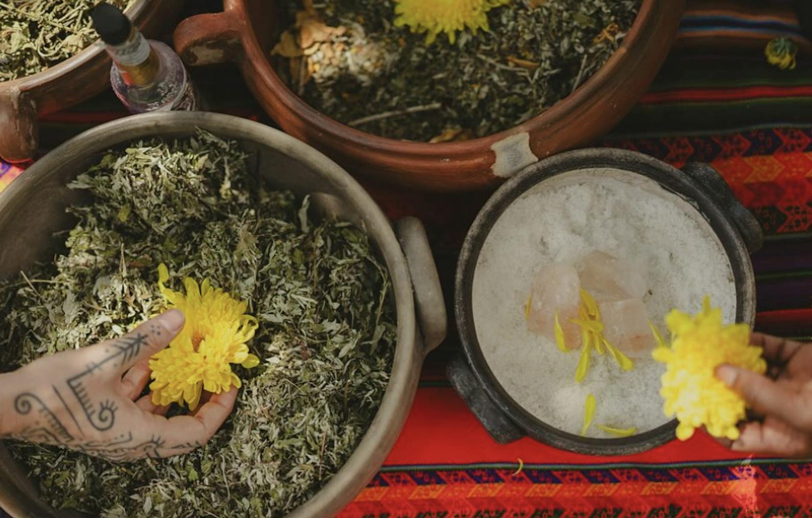 So you take a bowl, you put your herbs in the bowl and add salt, which opens up plants, and then some boiling water. You arrange your body over the bowl, so that the steam rises up and enters your body through the most absorbent tissues. The essential oil of the plants are released up into the steam and enter your body through the vaginal floor.