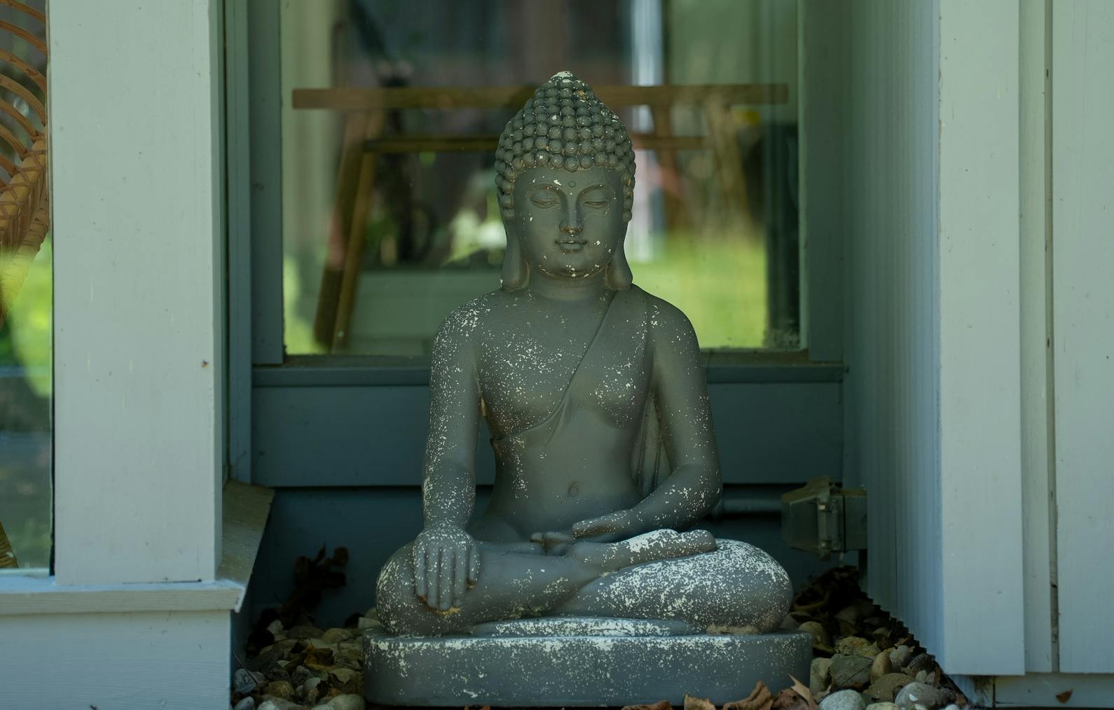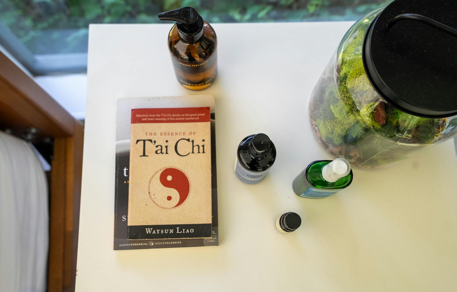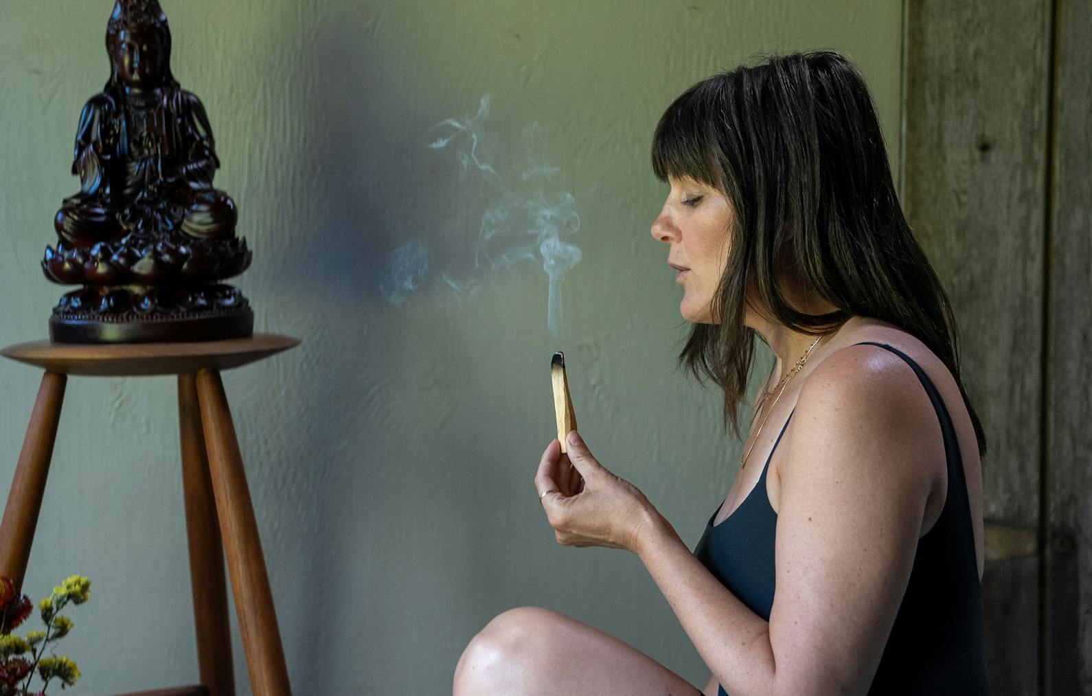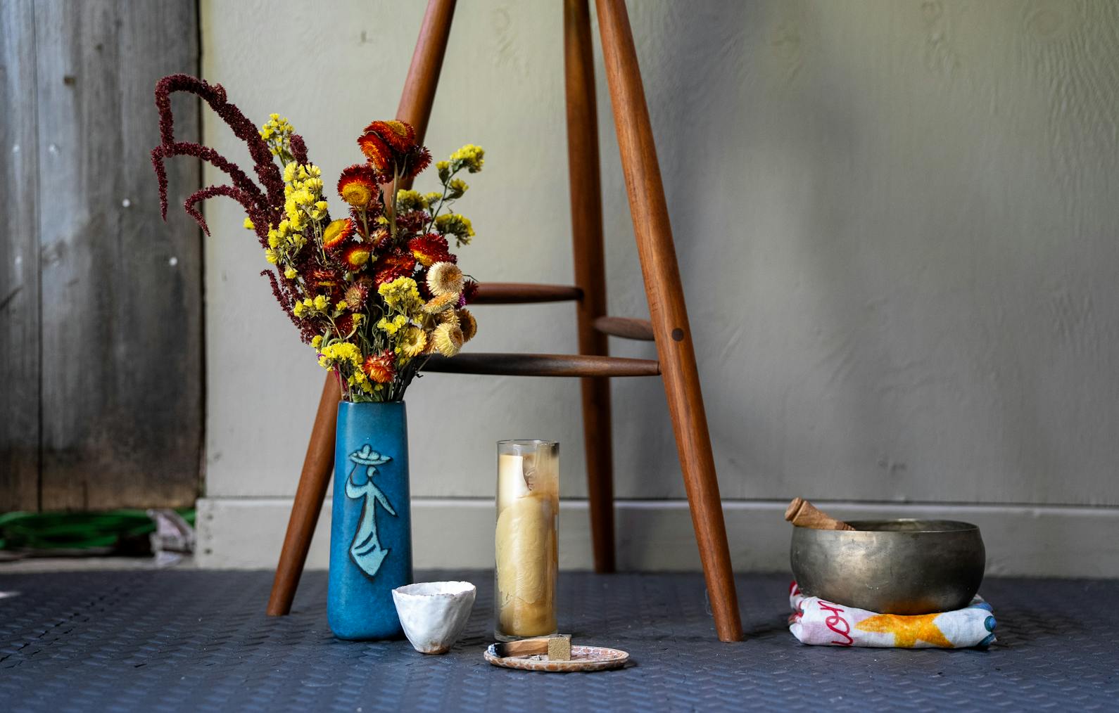 On my bedside table, you'll find a small stack of books—some in progress, others waiting their turn—and my favorite lip balm from Love Adorned. I also keep a yoga block next to my bed so I can ease into supported fish pose before sleep, a shape I’ve come to call the opening of my sea of forgiveness. While in the pose, I often do a gentle mindfulness body scan. That block might be my most beloved object. It is simple, but deeply supportive. In my Waving Moon studio space, my altar includes fresh flowers, a statue of Quan Yin, a candle, incense, palo santo, sage, and a small singing bowl.