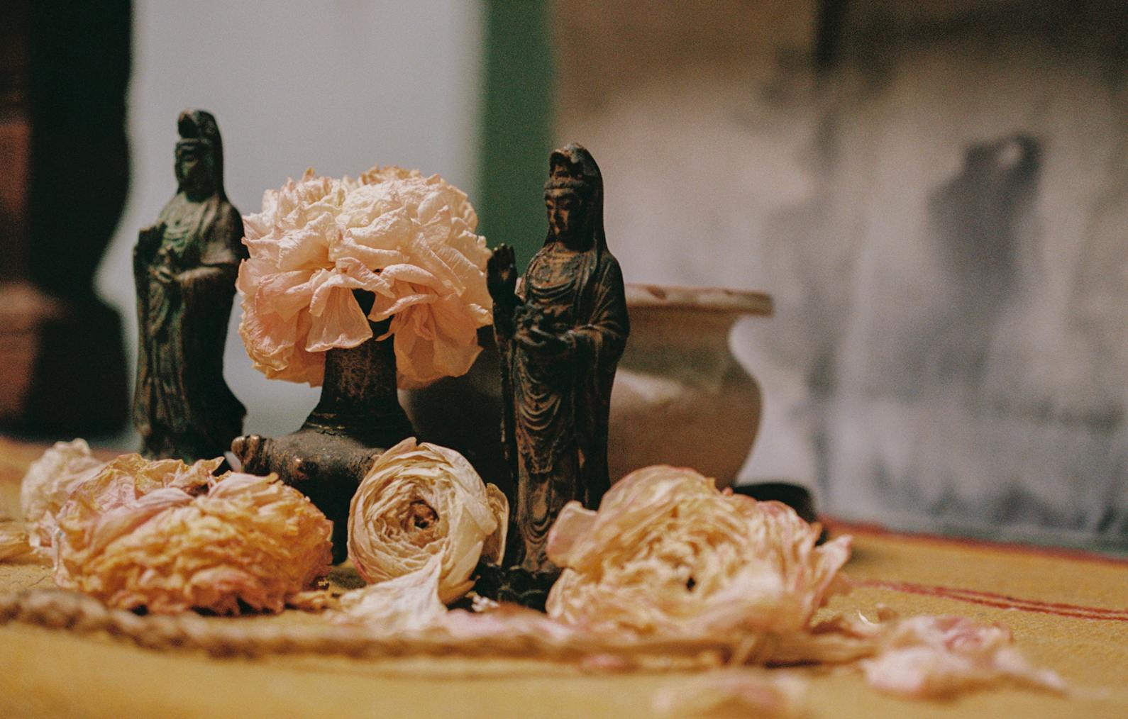 Next to my bedside right now is a little traveling altar. In the center there's a 300 year old Buddha that I found when I was in Japan that's sitting on a little stone of malachite. There's these two antique eyeliner containers from Thailand creating a sort of gate around the Buddha. And then there's these three amazing stones that came from a mud flat in upstate New York that were gifted to me recently by some really amazing humans who I sat in ceremony with. There is also a small incense holder. A place that supports me in holding my gratitude practice, a reminder to offer praise and prayer morning and night.